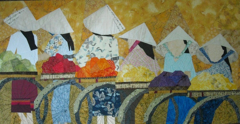 Hanoi is known for its vendors selling from the back of their bikes. This quilt depicts a row of women, their bikes piled with fruit, getting ready to head out..